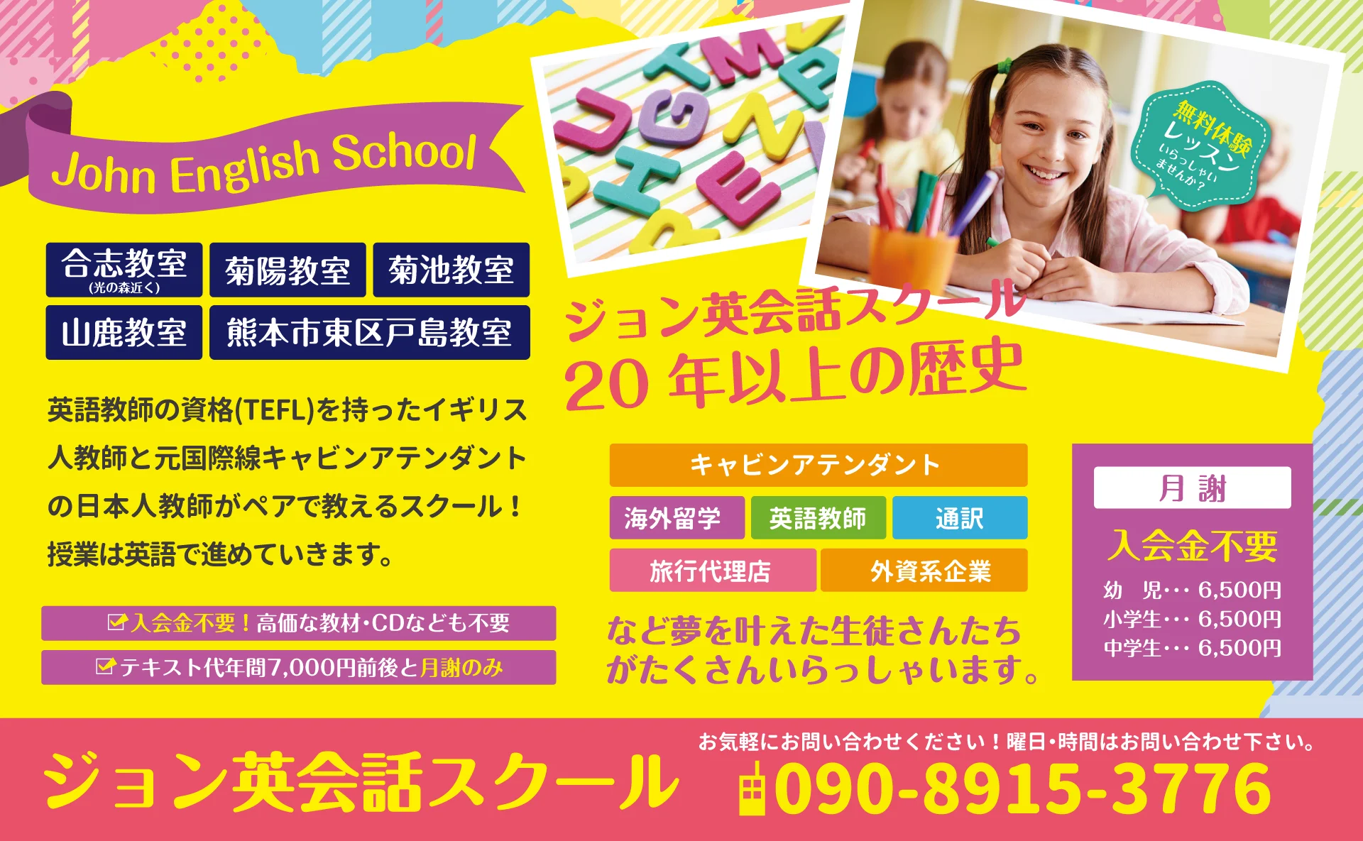 英語を子どもに習得させて、学校・就職に役立てたい!と、思われたことはないでしょうか? - ジョン英会話スクールは英語教師の資格(TEFL)を持ったイギリス人教師と元国際線キャビンアテンダントの教師がペアで教えるスクールです。授業は英語で進めていきます。そうすることによって、子ども達の英語を聞きとる力(リスニング)がびっくりするほど伸びていきます。熊本での英語教師の資格(TEFL)保持者は数人です。英会話を勉強・習得させたいと思われるなら、教師としてのトレーニングを受けたネイティブな先生に習われると効果的です。上達が違います。